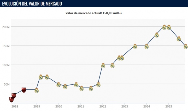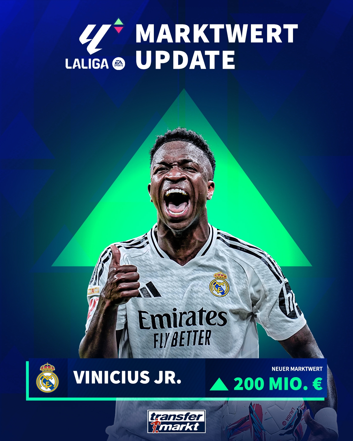 10月02日讯 德转今天发布了最新一期西甲身价更新,维尼修斯成为此次更新的焦点,他的身价从1.7亿欧下落到了1.5亿欧。