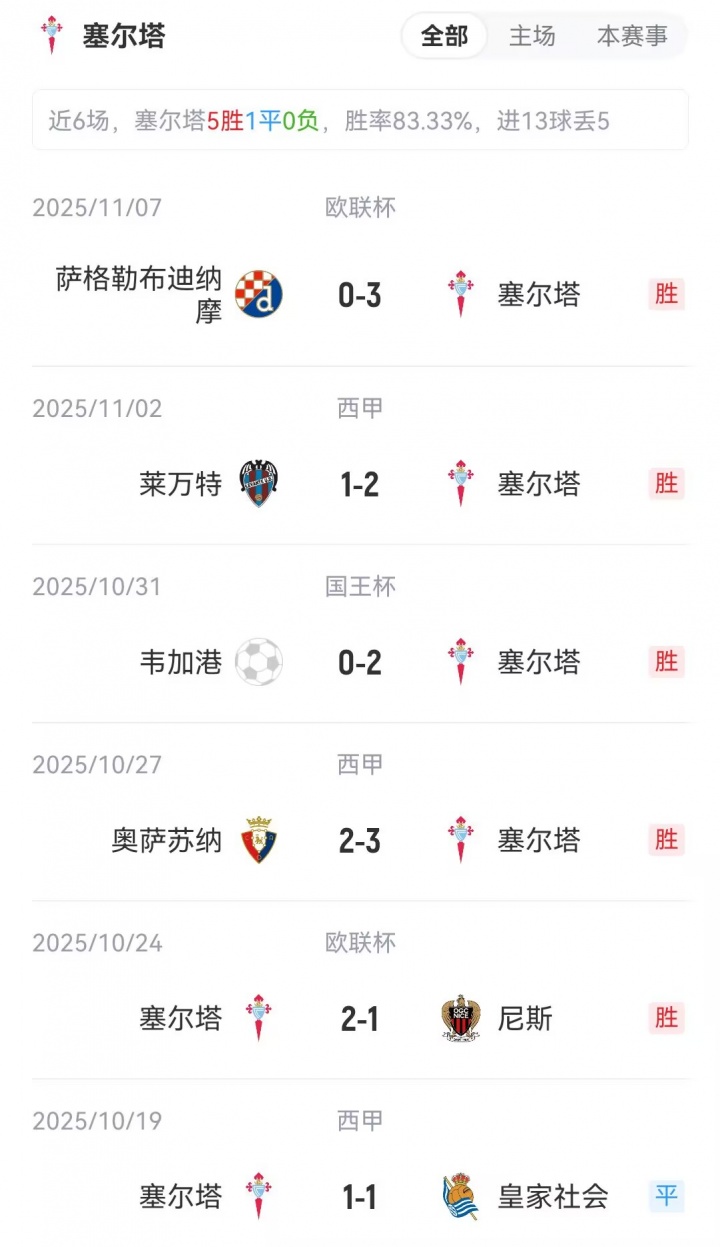 塞尔塔首发:13-拉杜、2-斯塔费尔特、3-明格萨、5-塞尔吉奥·卡雷拉、12-马努·费尔南德斯、20-马科斯·阿隆索、6-莫里巴、22-索特洛、7-伊格莱西亚斯、9-尤特格拉、18-巴勃罗·杜兰
