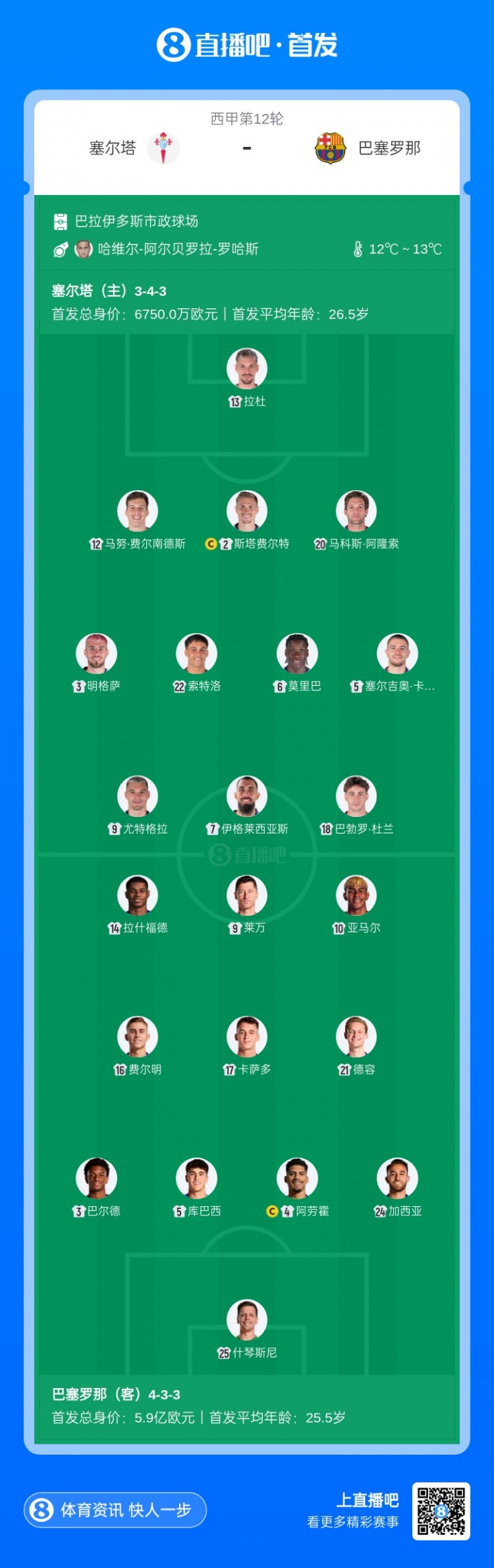 11月10日讯 北京本领11月10日4:00,西甲第12轮,塞尔塔vs巴萨。赛前两边公布了本场比赛的首发名单。【巴萨方面,莱万本场转头首发,与亚马尔、拉什福德构成三叉戟。赛前巴萨作念出首发退换,奥尔莫换下卡萨多。塞尔塔方面,明格萨、马科斯·阿隆索、莫里巴、尤特格拉均靠近旧主首发。】
