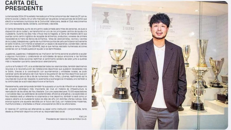 瓦伦西亚俱乐部主席Kiat Lim(林荣福女儿)在行将召开的鼓吹大会前,向俱乐部鼓吹们发布了一封包含在非经济措置叙述中的信。在这封信中,Kiat Lim谈到了俱乐部和球迷在DANA灾害时刻展现的合营精神,以及搬迁至新梅斯塔利亚球场对当年的要紧性。