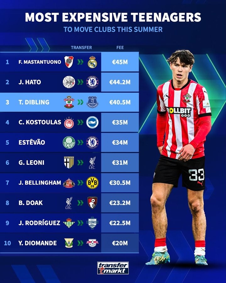 3、迪布林,南安普顿→埃弗顿,4050万欧元