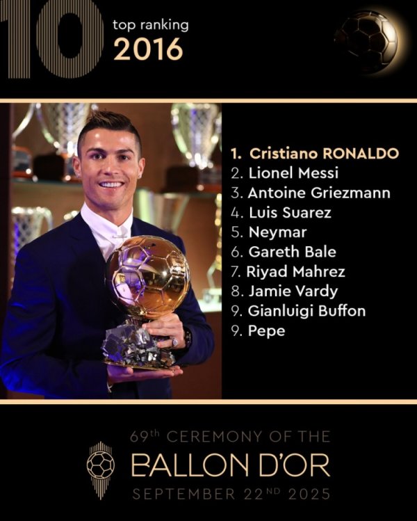 金球奖官方回顾2016年前十名:C罗夺魁,梅西、格列兹曼二三位
