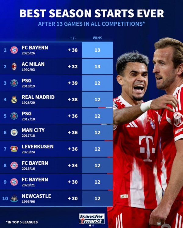 10月27日讯 拜仁在本轮德甲焦点战3-0完胜门兴,不竭了赛季开局全胜战绩,也追平米兰的五大联赛球队单赛季各项赛事开局连胜记载。《转会阛阓》也统计了五大联赛球队历史的单赛季各项赛预先13场比赛的胜场情况。 德转列五大联赛球队赛季各项赛预先13场最好开局: 1.拜仁慕尼黑 (2025/26赛季),+38净胜球,13胜 2.AC米兰 (1992/93赛季),+32净胜球,13胜 3.巴黎圣日耳曼 (2018/19赛季),+39净胜球,12胜 4.皇家马德里 (1928/29赛季)......查看更多