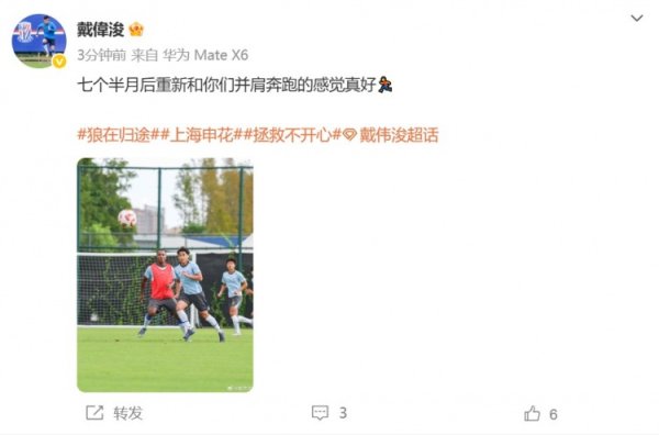 9月18日讯 申花球员戴伟浚更新社媒,晒出进入球队合练的像片。 在赛季前上海申花vs天津津门虎的热身赛中,申花中场戴伟浚遭受左膝前十字韧带断裂的重伤,他在2月承袭手术后运行进行康复。 二次转会窗口,申花为戴伟浚在中超补报名,而在球队上轮对阵泰山的赛前,主帅斯卢茨基显露,戴伟浚本赛季复出可能比拟费事。 今天,戴伟浚在个东谈主社媒晒出一张他进入球队合练的像片,并配文:七个半月后再行和你们并肩奔波的嗅觉真好。......查看更多
