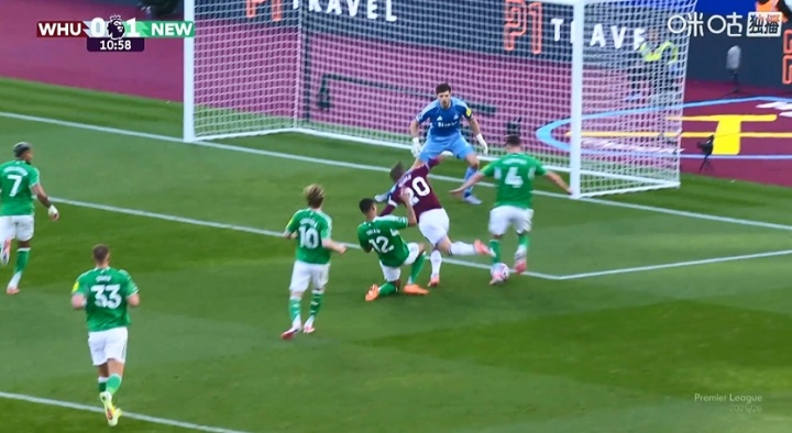比赛第11分钟,佳夫犯规送点,经VAR介入,主裁场边不雅看回放后阐明佳夫触球,点球取消,纽卡仍1-0跳跃西汉姆。