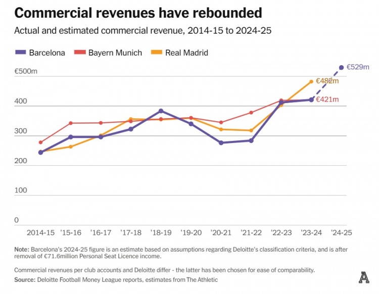 增长仍在延续。巴萨将PSL收入计入生意项,但即便视其为一次性收益剔除,按德勤口径估算,其生意营收可能仍冲破5亿欧元。