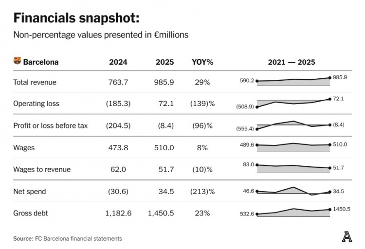 到2022年头,巴萨财务已如斯厄运,其SCL竟为负数(负1.444亿欧元)。这彰着无法知足,实践意味着他们无法注册新球员,必须大幅加多收入或削减开支才能破局。