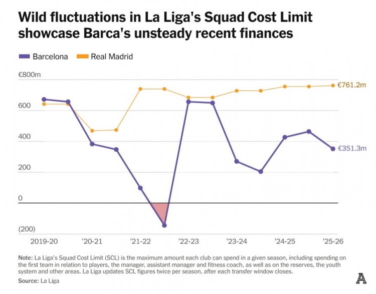 西甲球队成本上限的剧烈波动突显了巴萨近期财务景象不屈稳