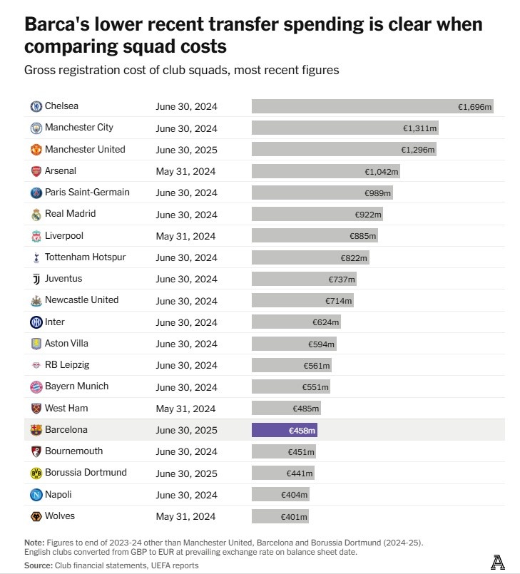 当比拟球队成本时,巴萨近期较低的转会支拨了然于目