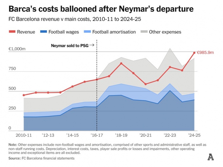 四年往日,矫正决策再度脱期,资金连续流出:22/23赛季参加1.06亿欧元,次年增至3.22亿欧元,上赛季再投4.15亿欧元。限制2025年6月,样式成本支拨已达9.75亿欧元(见下图)。后续参加仍将巨大。