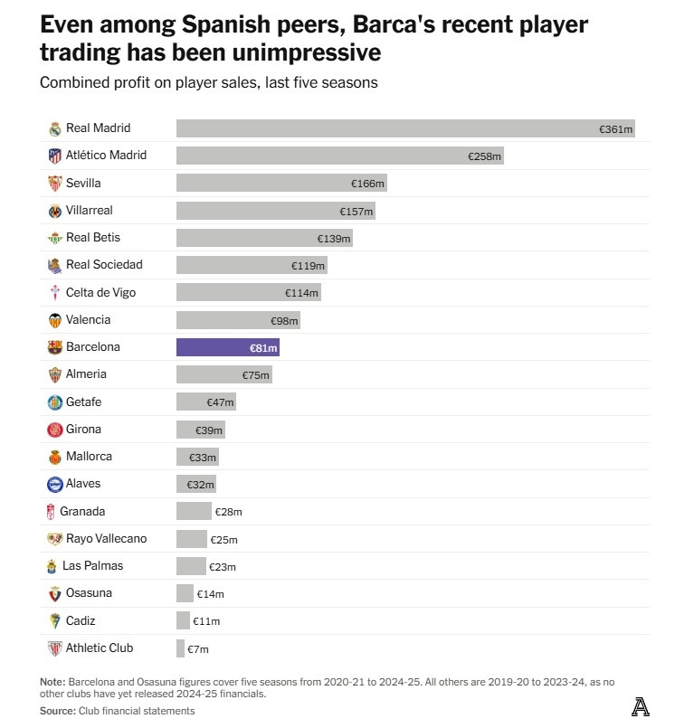 而后卖东说念主收益缩水,即便23/24赛季通过出售登贝莱、凯西和尼科-冈萨雷斯赚钱8060万欧元。往日五赛季球员销售总利润仅8140万欧元,若非21/22赛季对球员价值计提1.6亿欧元减值,数字将更丢脸。此利润水平在西甲中游,远过期于两家马德里俱乐部及欧洲多家敌手。