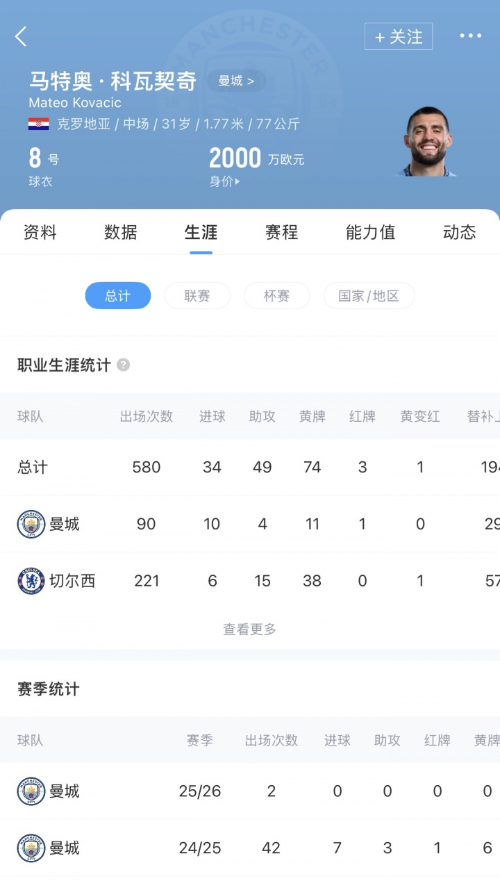 科瓦契奇今夏汲取跟腱手术后,本赛季尚未为曼城首发过。他在九月对阵伯恩利时伤愈插足比赛名单,但仅在对阵埃弗顿和比利亚雷亚尔时替补出场。