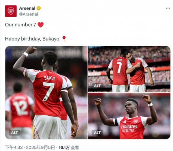 阿森纳官方祝萨卡24岁寿辰悠然,球员为枪手出战265场71球71助