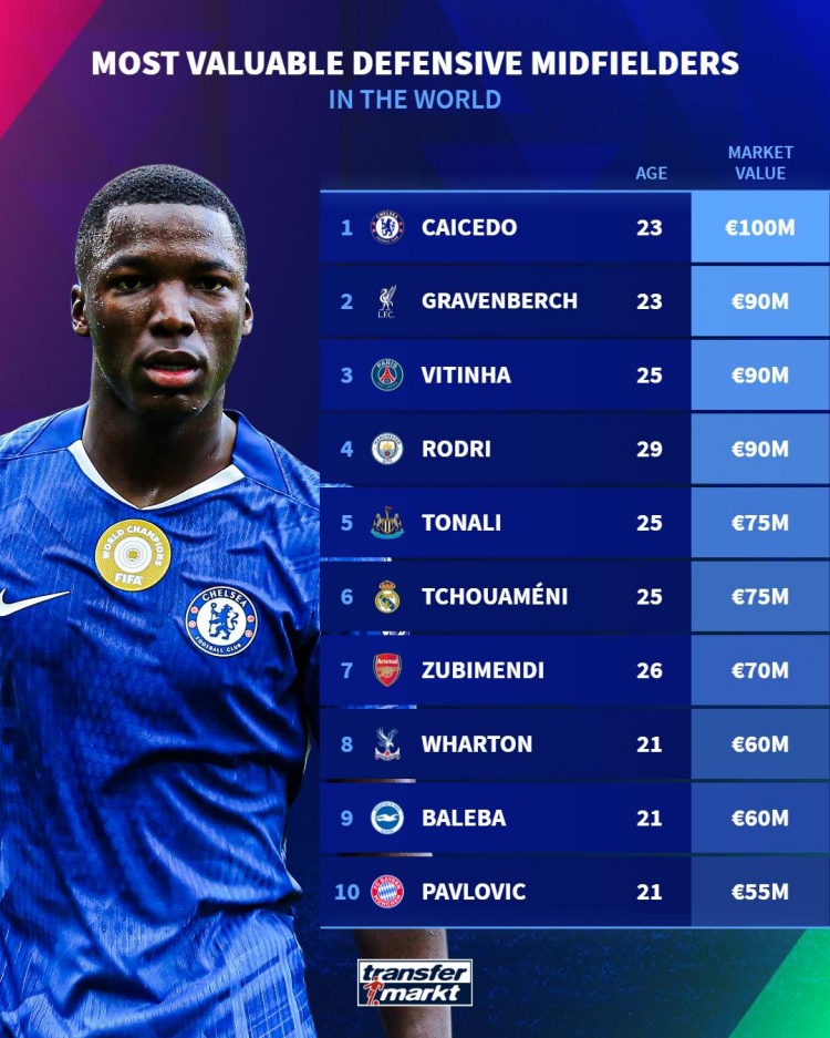 防患型中场身价榜:凯塞多1亿欧居首,赫拉芬贝赫9000万欧