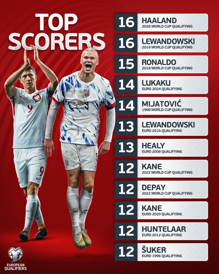 欧足联列单届世欧预/欧初赛进球榜:哈兰德、莱万16球居首