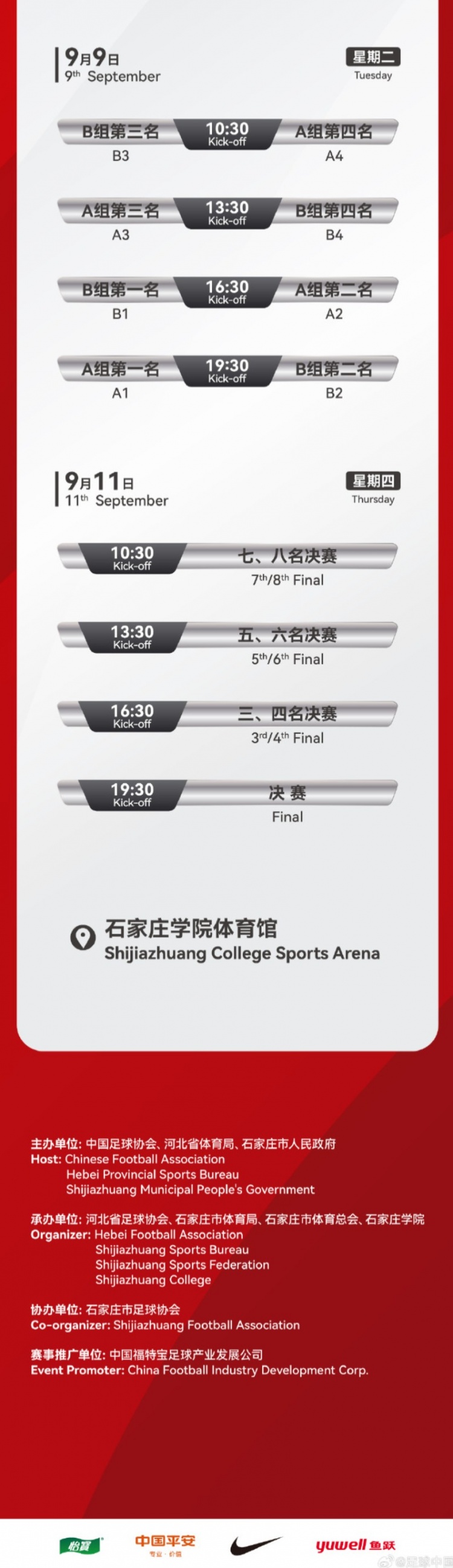 2025CFA中国之队·“北东谈主集团”石家庄五东谈主制足球海外邀请赛赛程公布!中国国度须眉五东谈主制足球队与柬埔寨须眉五东谈主制足球队、丹麦须眉五东谈主制足球队、印度尼西亚须眉五东谈主制足球队、韩国须眉五东谈主制足球队、缅甸须眉五东谈主制足球队、新西兰须眉五东谈主制足球队、阿联酋须眉五东谈主制足球队九月约战河北石家庄。