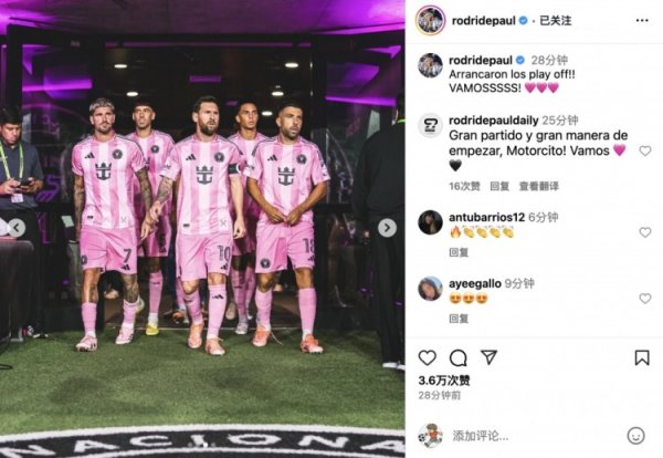 10月25日讯 好意思职联季后赛1/8决赛,迈阿密国外主场3比1打败纳什维尔。赛前,德保罗更新社媒庆祝球队得手。 德保罗社媒写说念:季后赛开战啦!!加油!!! 🩷🩷🩷 好意思职联季后赛首轮为BO3赛制,下场迈阿密国外将客战纳什维尔,取胜即晋级,比赛将于11月2日7:30打响。......查看更多