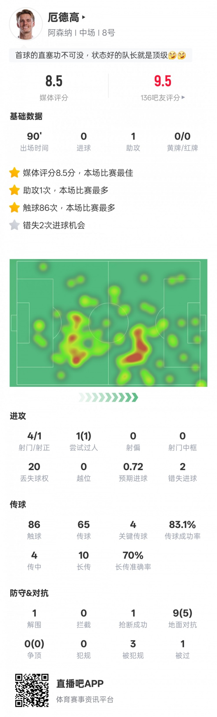 厄德高本场数据:1助攻4环节传球2错失进球契机,评分8.5全场最高