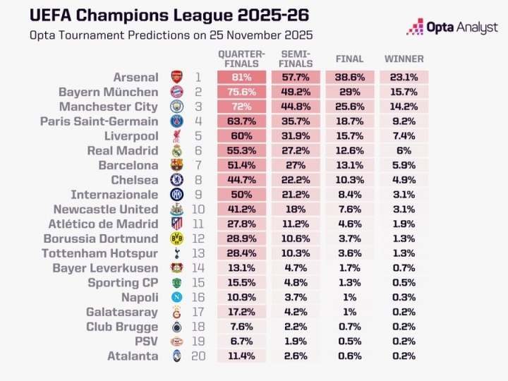 Opta最新欧冠夺冠概率:阿森纳23.09%第一,拜仁曼城巴黎分列2-4