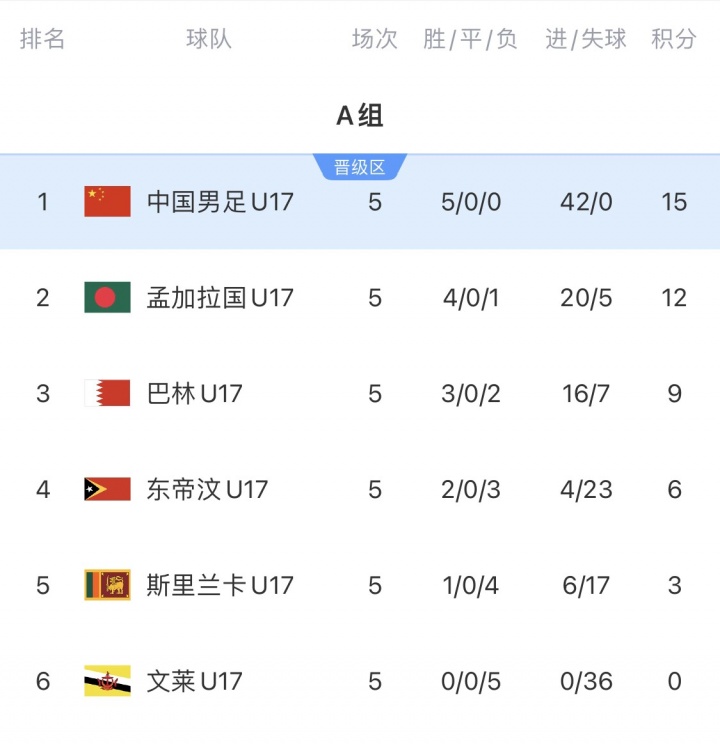 12月01日讯 2026年U17亚初赛结果,中国U16国少五战全胜、进42球0失球,以小组第一晋级正赛。