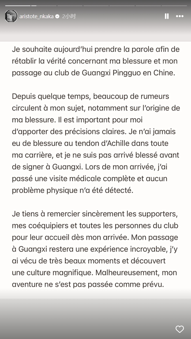 最近几周出现了好多对于我的传言,尤其是对于我伤病根源的说法。我以为有必要说明实质情况:在我的通盘劳动生计中,从未遇到过跟腱损害,与广西队签约时也并非带伤抵达。抵达俱乐部后我接收了全面体检,那时并未检出任何健康问题。