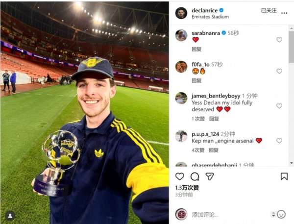实至名归!赖斯社媒晒与全场最好奖杯合照
