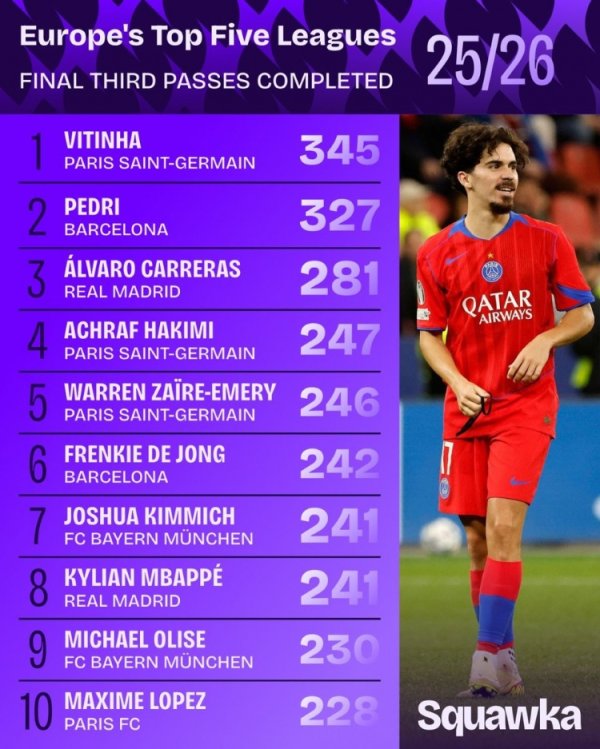 345次!维蒂尼亚的蹙迫三区完成传球次数位列五大联赛第一