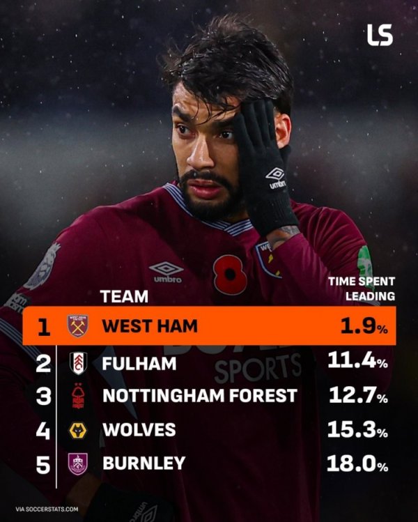 处境苦恼!西汉姆本赛季仅1.9%的比赛技能处于绝顶,位居联赛垫底