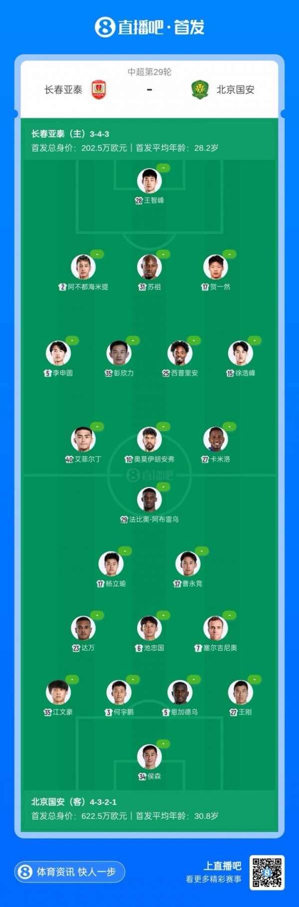 亚泰vs国安首发:艾菲尔丁、彭欣力先发,杨立瑜、塞尔吉尼奥出战