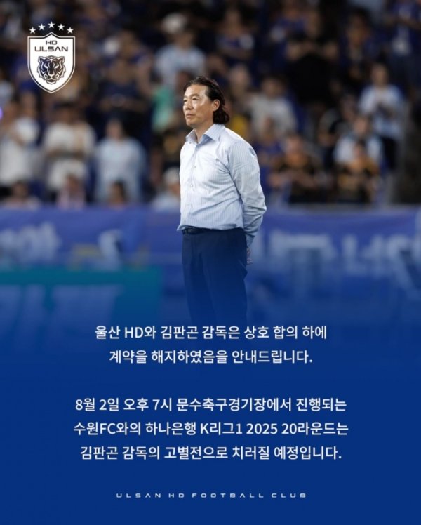 官方:蔚山HD与主帅金判坤协商一致排除条约