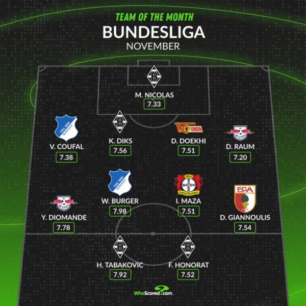 whoscored德甲11月最好阵:迪奥曼德、马扎、劳姆领衔,门兴4将