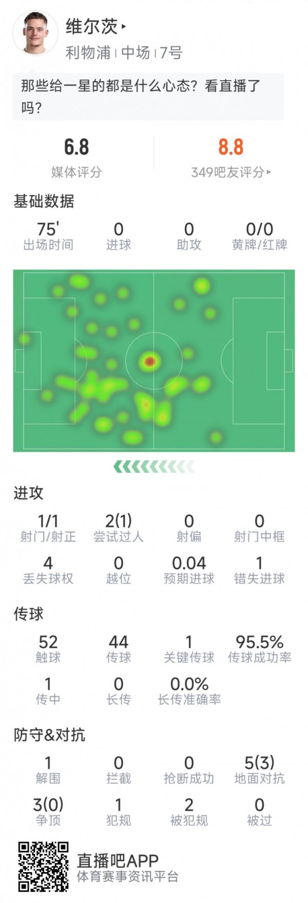 维尔茨本场数据:1要津传球,1次射正,传球到手率96%,1次失良机
