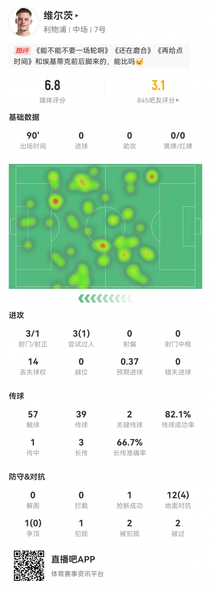 维尔茨未能展现出任何机敏度。这位德国国脚14次丢失球权,13次抵挡仅赢下4次(收遵守31%)。下半场一次传球诞妄后,他双手掩面——信心彰着已际遇重挫。