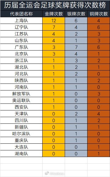 新统计了往届全运会11东说念主制足球名堂奖牌赢得情况和往届全运会足球奖牌赢得次数榜,见表。