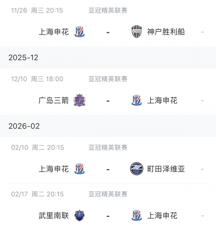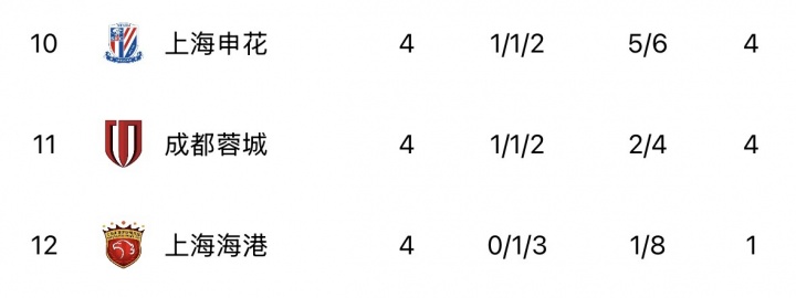 上海申花,上场亚冠精英联赛1-3输给柔佛新山,现在亚冠1胜1平2负积4分暂列小组第10,还剩4轮亚冠精英联赛比赛