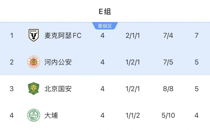 北京国安上轮亚冠二级联赛3-0大捷大埔,保留晋级淘汰赛但愿,现在在亚冠二级E组1胜2平1负,和小组第二河内公安队同积5分,暂列E组第3。