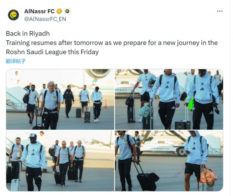 利雅得得胜官方社媒晒出像片,阐明主帅热苏斯携球员们回到利雅得,球队将在未来之后规复检修,为下场联赛作念准备。