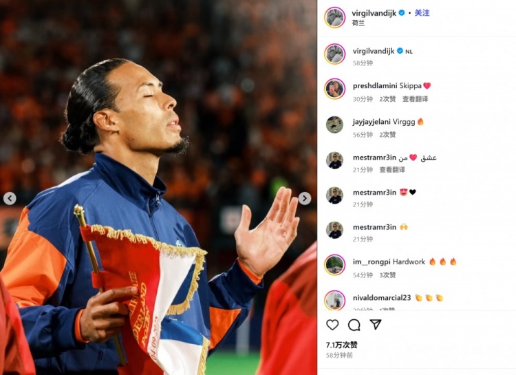 9月5日讯 荷兰在本轮世初赛主场1-1遭波兰绝平,34岁的荷兰队长范迪克在赛后通过社媒晒出多张比赛照。