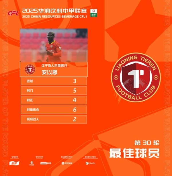 演出帽子戏法,辽宁铁东谈主球员安以恩当选中甲第30轮最好球员