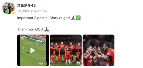 8月16日讯 海港主场4-1轻取河南队后,海港外助莱昂纳多更新社媒庆祝了这场得胜。 本场比赛半场补时阶段,莱昂纳多单刀晃过徐嘉敏,随后推射佛门到手,将场上比分扩大为3-0。 赛后,莱昂纳多在社媒发文写说念:“迫切的3分,荣耀归于天主,感谢天主!”......查看更多