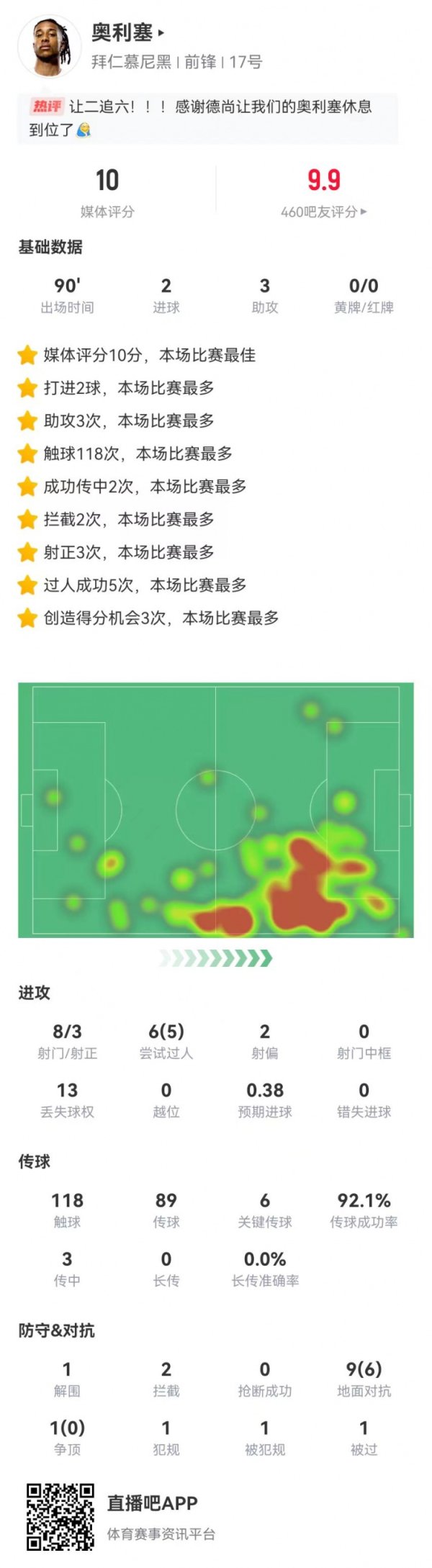 完好!奥利塞本场2球3助攻 8射3正+6要津传球 6过东谈主5告捷 获10分