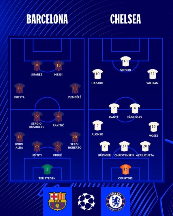 欧冠晒前次巴萨vs切尔西声威:梅西、小白、阿扎尔、坎特在列